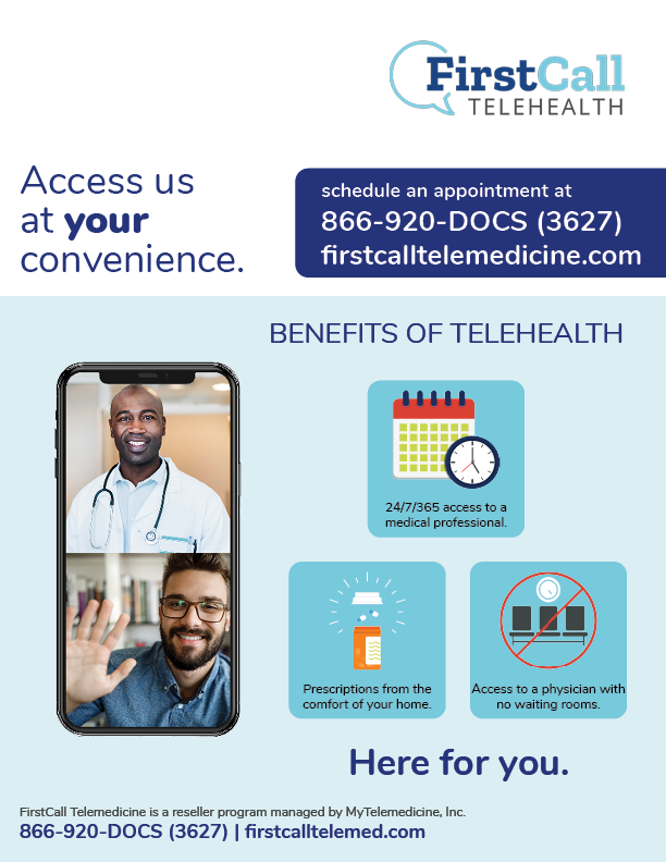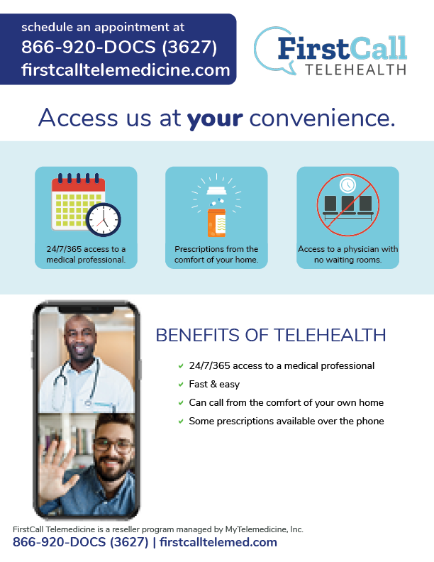 Copyright © 2023. FirstCall Telemedicine. All Rights Reserved. FirstCall Telemedicine services are provided through MyTelemedicine located at 610 Elm Street Suite 710, McKinney, Texas 75069. FirstCall Telavet services are provided through GoLexi located at 610 Elm Street Suite 710, McKinney, Texas 75069. FirstCall Telehealth 3rd party programs (MyTelemedicine and GoLexi) are hosted on the FirstCall Telehealth product platform. Credit card/ACH line items will be listed as FirstCall Telemedicine. FirstCall Telemedicine administered by MyTelemedicine does not guarantee any prescriptions will be written during consultation. Substances controlled by the DEA, lifestyle drugs, and other drugs that have the potential for abuse will not be prescribed. FirstCall Telemedicine administered by MyTelemedicine’s doctors and physicians hold the right to refuse care for potential misuse of services.