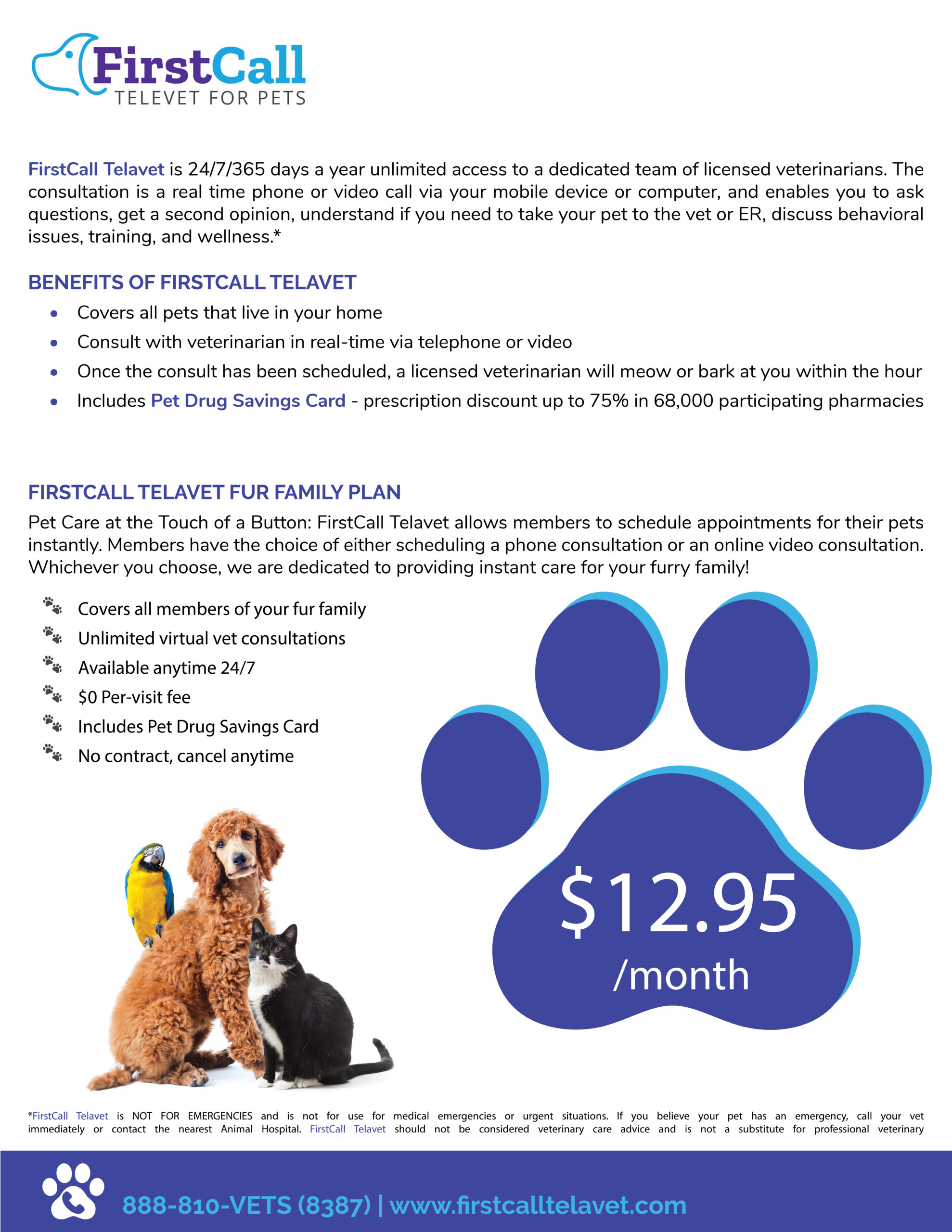 Pet Care at the Touch of a Button: FirstCall Telavet allows members to schedule appointments for their pets instantly. Members have the choice of either scheduling a phone consultation or an online video consultation. Whichever you choose, we are dedicated to providing instant care for your furry family!