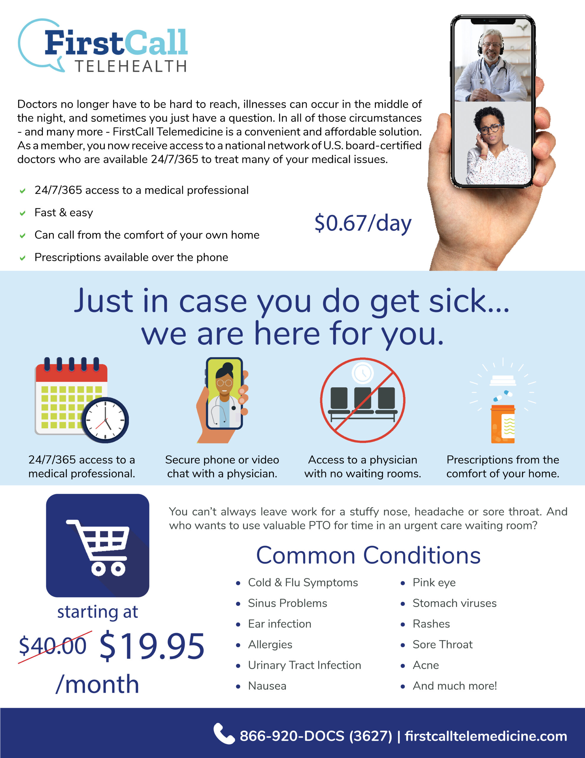 Just imagine, you wake up one morning with sudden cold-like symptoms, such as a stuffy nose, cough, and congestion. You’re having trouble getting an appointment with your primary care doctor, and you don’t want to miss time at work by sitting in an urgent care or ER waiting room. Call or video chat with a FirstCall provider anytime for a $0 consultation fee and only $19.95/month for an individual and $24.95 for a family of seven!