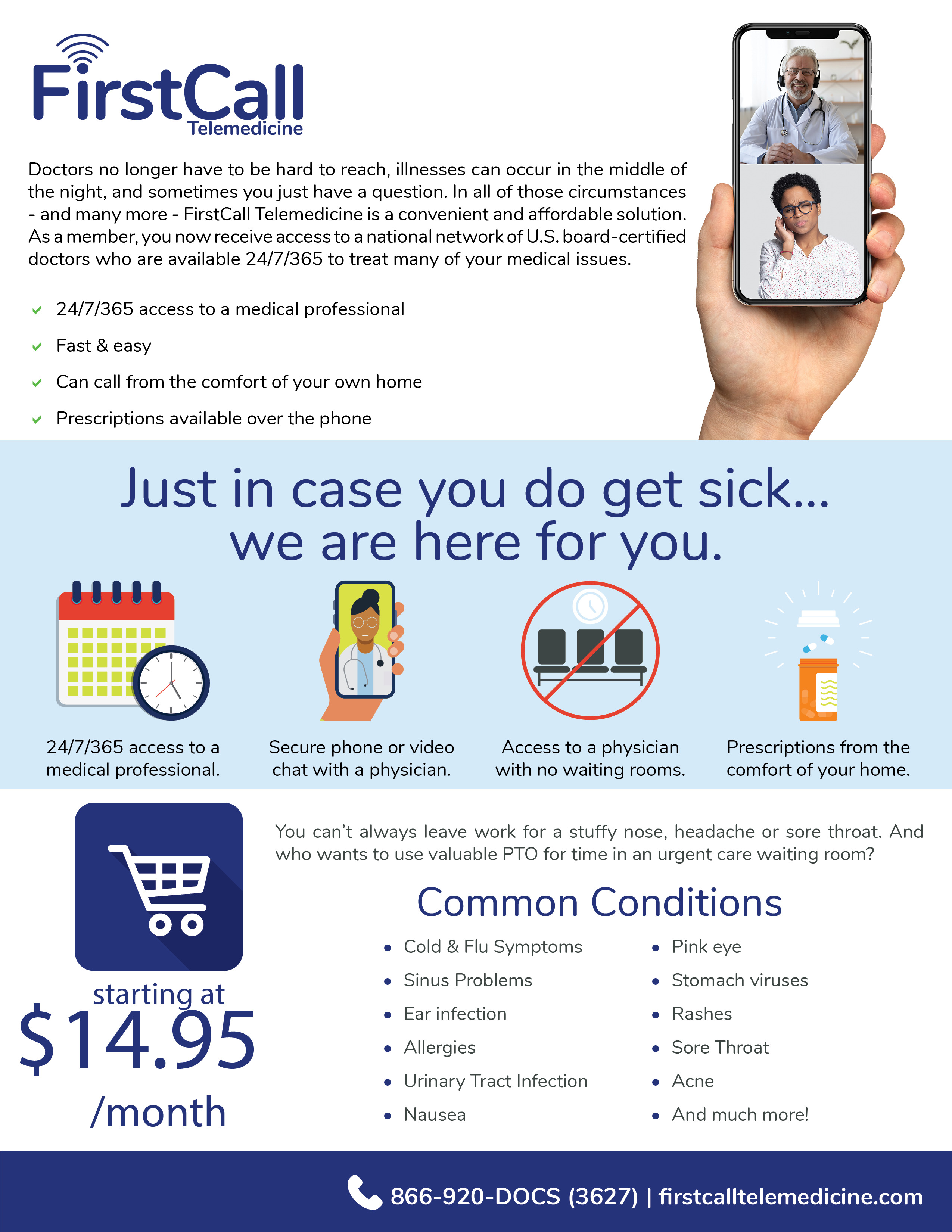 Just imagine, you wake up one morning with sudden cold-like symptoms, such as a stuffy nose, cough, and congestion. You’re having trouble getting an appointment with your primary care doctor, and you don’t want to miss time at work by sitting in an urgent care or ER waiting room. Call or video chat with a FirstCall provider anytime for a $0 consultation fee and only $14.95/month for an individual and $19.95 for a family of seven!